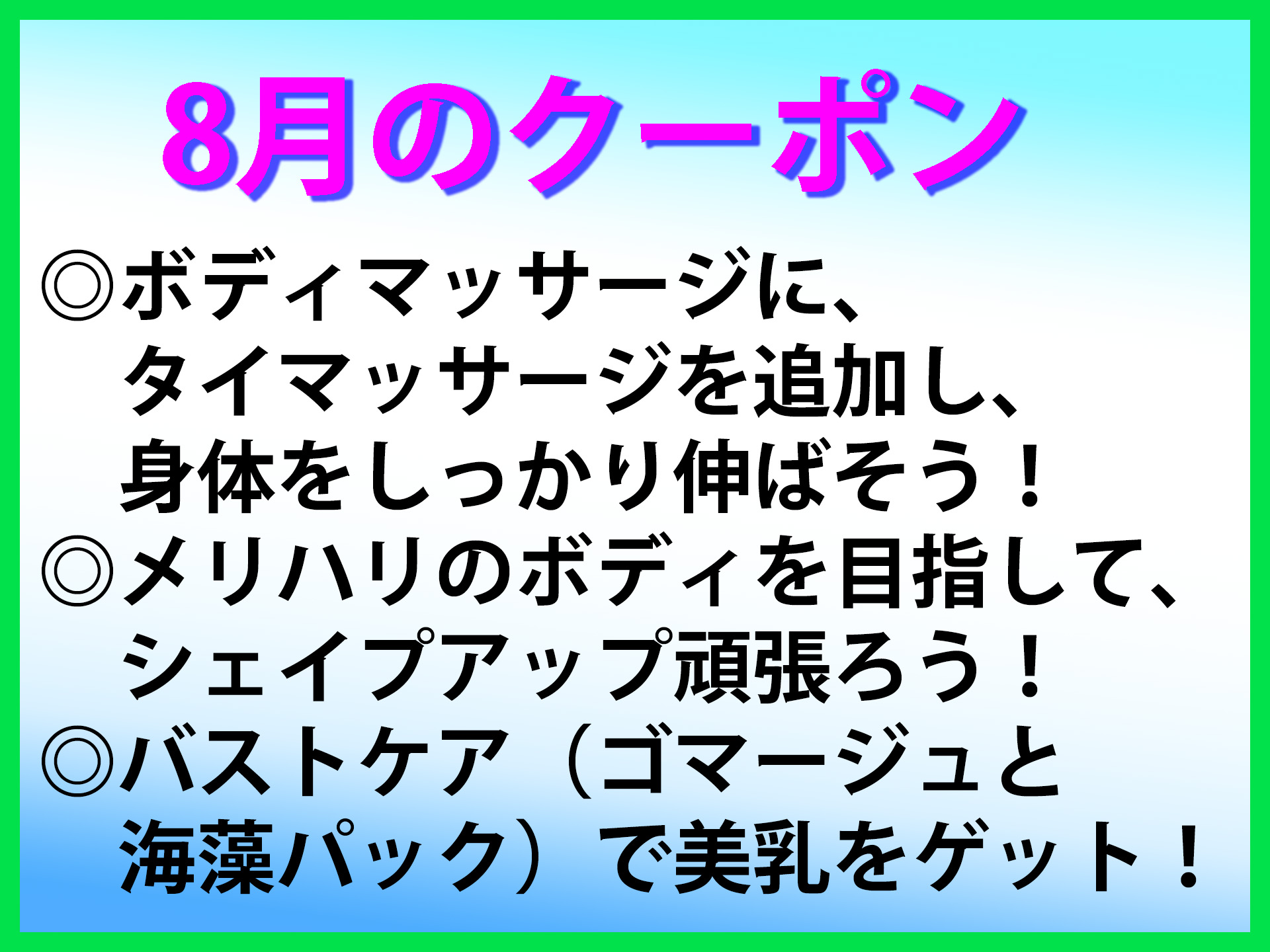 8月限定のクーポンを掲載しました。 8月のテーマは、 ◎ボディマッサージに、タイマッサージを追加し、身体をしっかり伸ばそう! ◎メリハリボディを目指して、シェイプアップ頑張ろう! ◎バストケア(ゴマージュと海藻パック)で美乳をゲット! です。 ボディマッサージにタイマッサージを追加するとお得になります。 タイマッサージのストレッチを追加することで、身体をしっかり伸ばすことができます。 固まった身体が柔軟になり、疲れもしっかり取れますよ。 メリハリボディを目指している方には、シェイプアップマッサージと全身の筋トレがお得になります。 無駄なぜい肉を落とし、柔らかな筋肉を付けてカッコ良いボディを手に入れましょう! 定番のバストケアもお得になります。 ゴマージュと海藻パックとマッサージを組み合わせて、フワフワで透明感のあるキュートな美バスト作りましょう! |