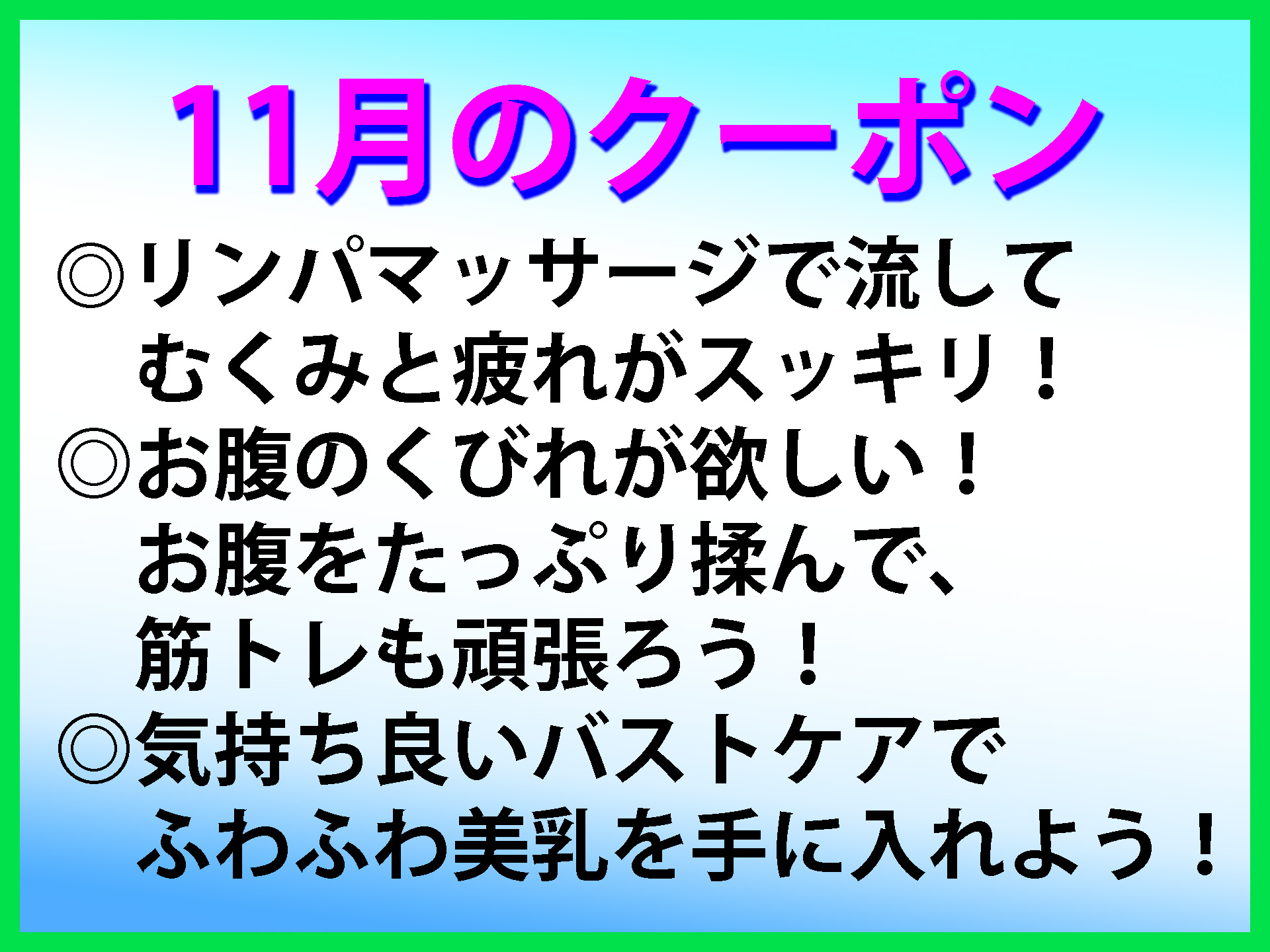 11月限定のクーポンを掲載しました。 11月のテーマは、 ◎リンパマッサージで流してむくみと疲れがスッキリ! ◎お腹のくびれが欲しい! お腹をたっぷり揉んで、筋トレも頑張ろう! ◎気持ち良いバストケアで、ふわふわ美乳を手に入れよう! です。 疲れもむくみもスッキリさせたい時はリンパマッサージがお勧め。 リンパを徹底的に流します。 お帰りの際には、履物がユルユルになるので注意して下さいね。 食欲の秋でお腹が気になってきた方は、お腹の集中マッサージをお試し下さい。 筋トレも頑張れば更に効果的! この秋は美乳を手に入れましょう。 ゴマージュで磨いて、海藻パックで栄養補給、バストマッサージでふわふわに。 バストが綺麗になると気分も自信もアップ! |