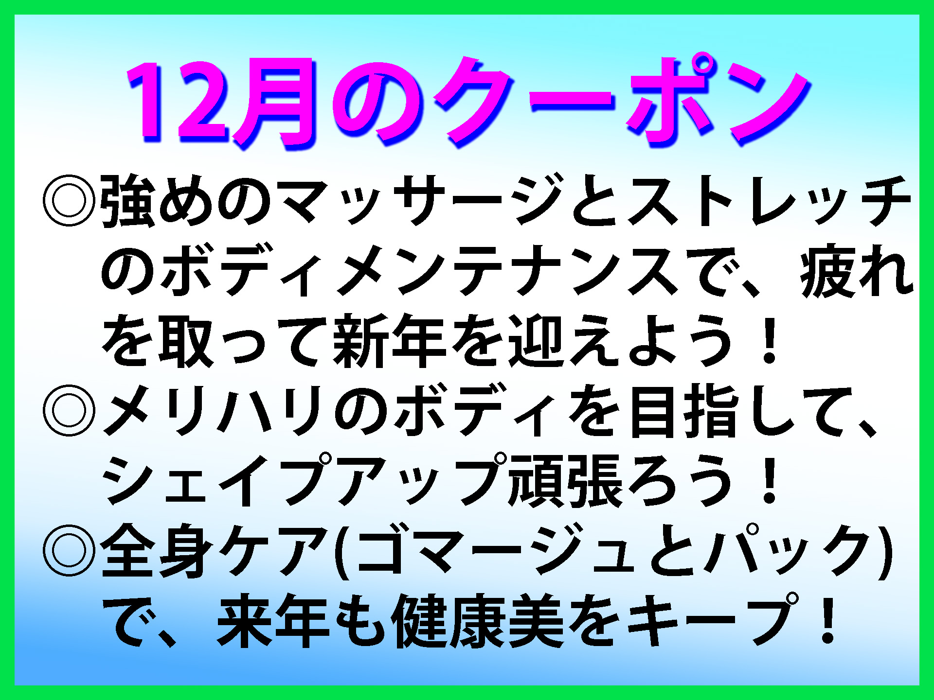 12月限定のクーポンを掲載しました。 12月のテーマは、 ◎強めのマッサージとストレッチで、疲れを取って新年を迎えよう! ◎メリハリのボディを目指して、シェイプアップ頑張ろう! ◎全身ケア(ゴマージュとパック)で、来年も健康美をキープ! です。 今年も後一ヶ月になりました。 来年に向けて、今年の疲れをしっかり取っておきましょう! 強めのマッサージとストレッチで疲れを取るボディメンテナンスがお得になります。 この機会に、コリコリにコリが溜まったお身体を癒して上げましょう。 メリハリボディを目指している方にはシェイプアップマッサージがお得になります。 筋トレメニューも合わせるとより効果的です。 頑張った分だけ、結果が付いてきます。 健康美を目指している方は、全身ケア(全身ゴマージュ+全身パック+ボディトリートメント)がセットでお得になります。 全身をピカピカに磨いて、来年を迎えましょう。 フェイシャル美顔コースも加えて、今年のご自身へのご褒美として1日を過ごすのも良いですね。 |
