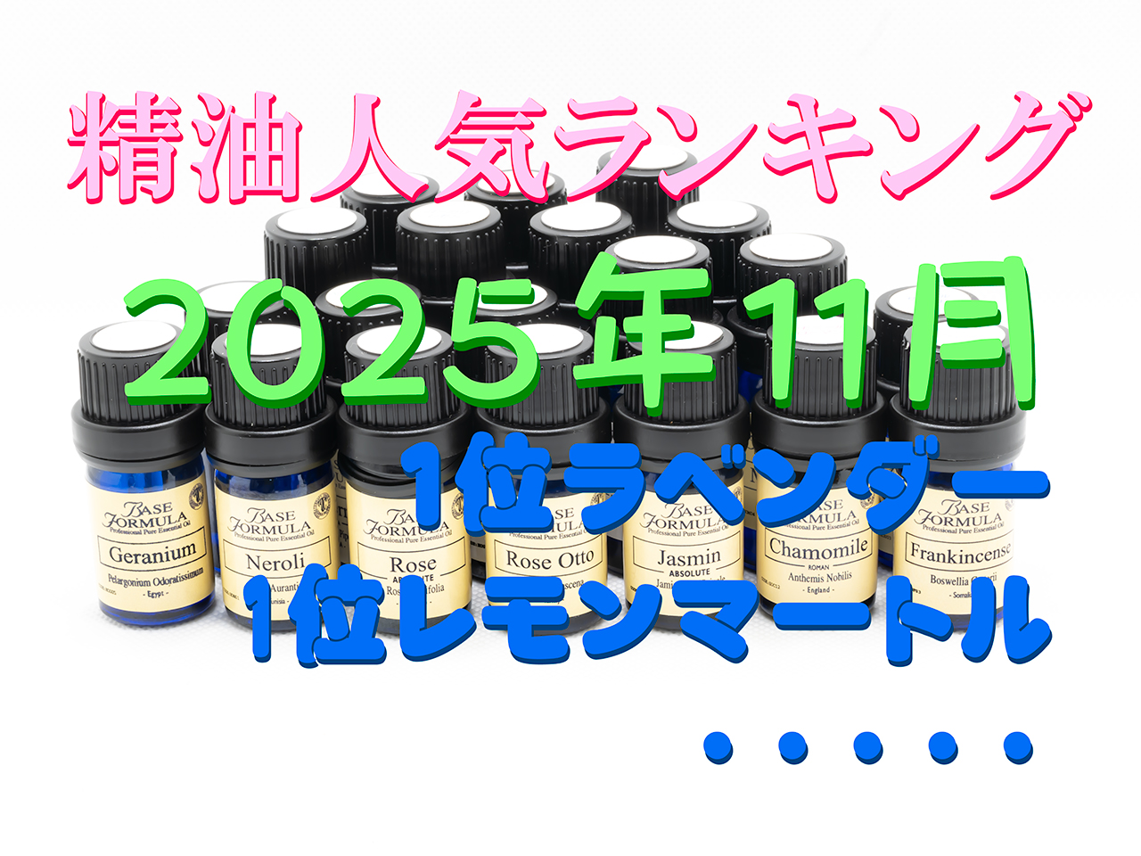 2025年11月に使用された精油のランキングです。 1位 ラベンダー(22.2%) 1位 レモンマートル(22.2%) 1位 ローズマリー(22.2%) 4位 オレンジ・スイート(11.1%) 4位 ジャスミン(11.1%) 4位 ローズ・アブソリュート(11.1%) 今月は爽やかな香りが多く選ばれました。 秋の爽やかな日を爽やかな香りで癒しの時間を楽しむのは良いですね。 あと、ジャスミンやローズなどの華やかな花の香りも選ばれています。 華やかな香りで贅沢気分を味わうのも良いですね。 |