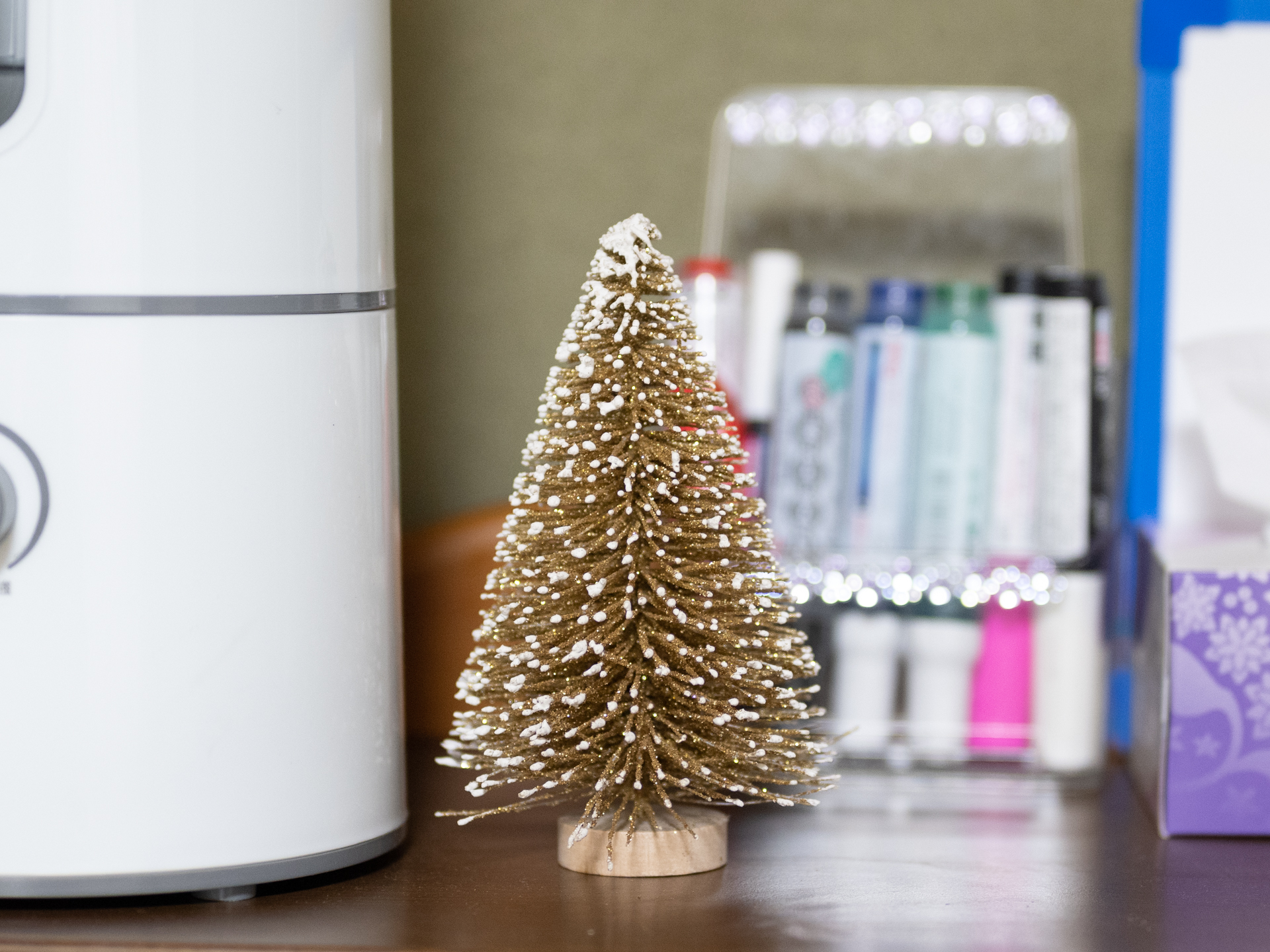 | 施術部屋のサイドボードに小さなクリスマスツリーを置きました。 |