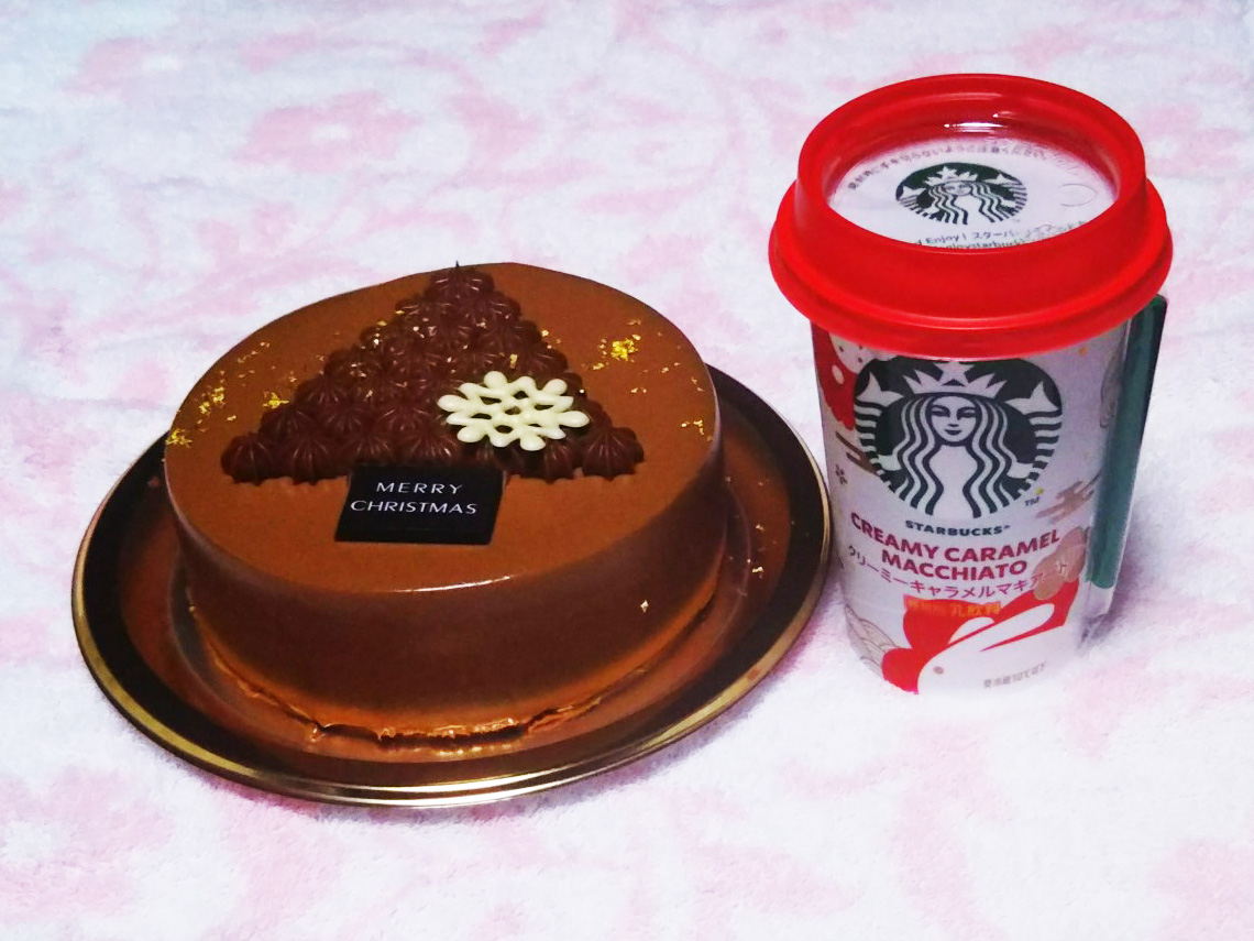 クリスマスイブにお客様から頂きました。 モロゾフのクリスマスケーキとスタバのクリーミーキャラメルマキアート。 マキアートは新春デザインでウサギが描かれています。 |