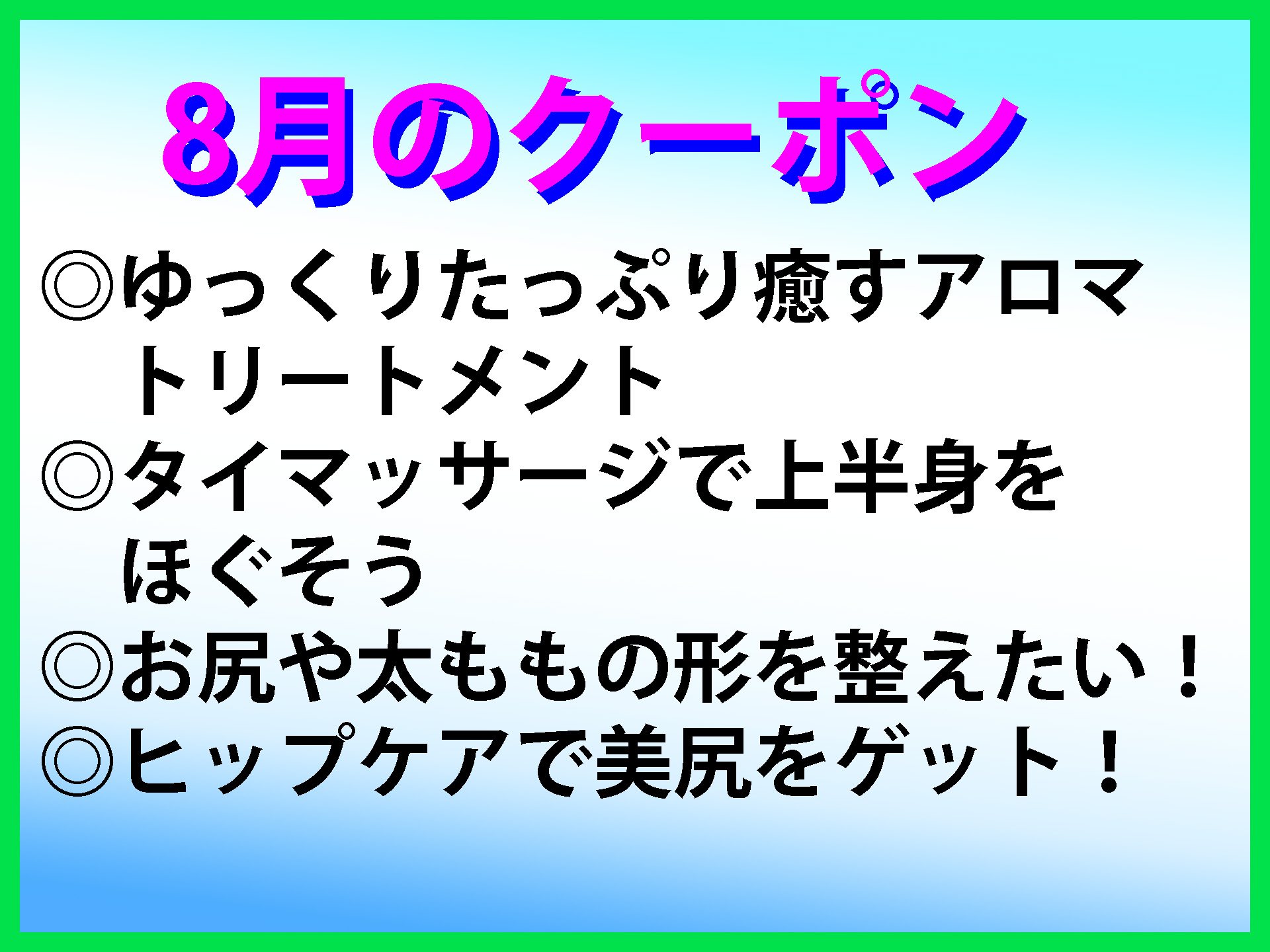 8月限定のクーポンを掲載しました。 8月のテーマは、 ◎ゆっくりたっぷり癒すアロマトリートメント ◎タイマッサージで上半身をほぐそう ◎お尻や太ももの形を整えたい! ◎ヒップケアで美尻をゲット! です。 |