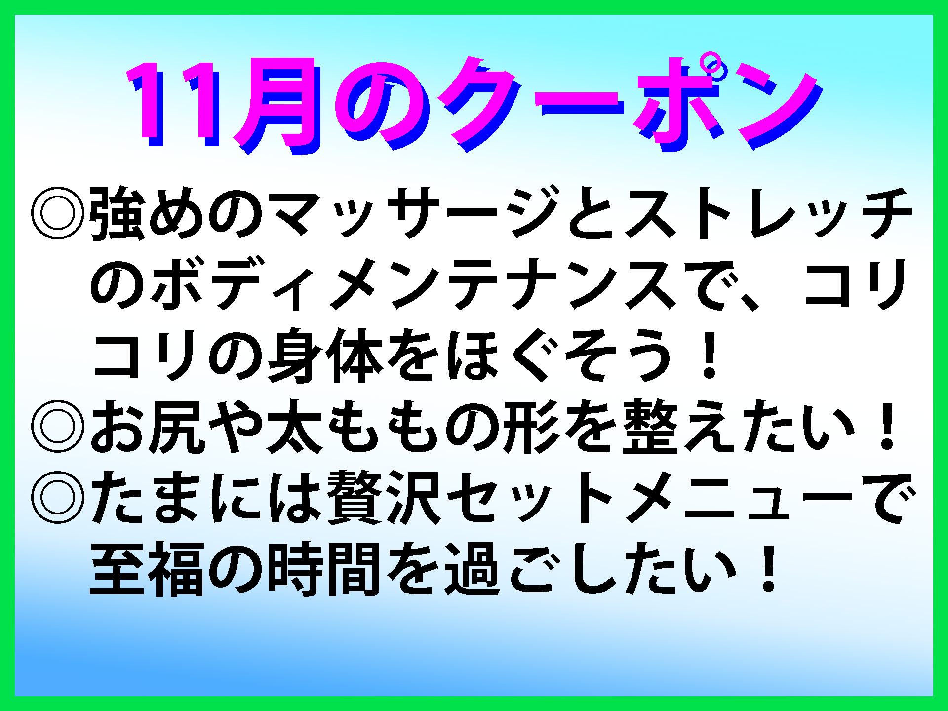 11月限定のクーポンを掲載しました。 11月のテーマは、 ◎強めのマッサージとストレッチのボディメンテナンスで、コリコリの身体をほぐそう! ◎お尻や太ももの形を整えたい! ◎たまには贅沢セットメニューで至福の時間を過ごしたい! です。 |