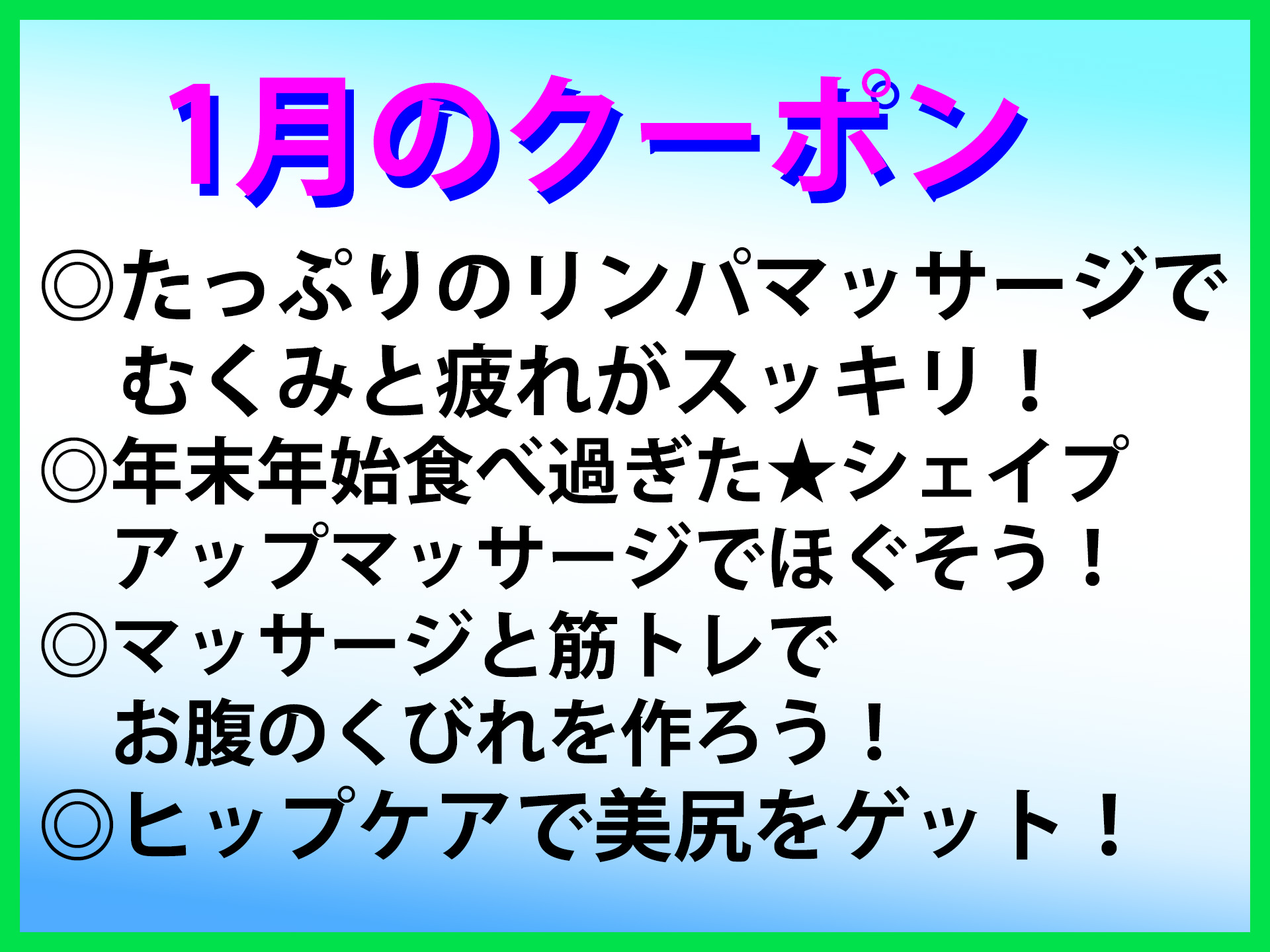 来年1月限定のクーポンを掲載しました。 来年1月のテーマは、 ◎たっぷりのリンパマッサージでむくみと疲れがスッキリ ◎年末年始食べ過ぎた★シェイプアップマッサージほぐそう! ◎マッサージと筋トレでお腹のくびれを作ろう! ◎ヒップケアで美尻をゲット! です。 |
