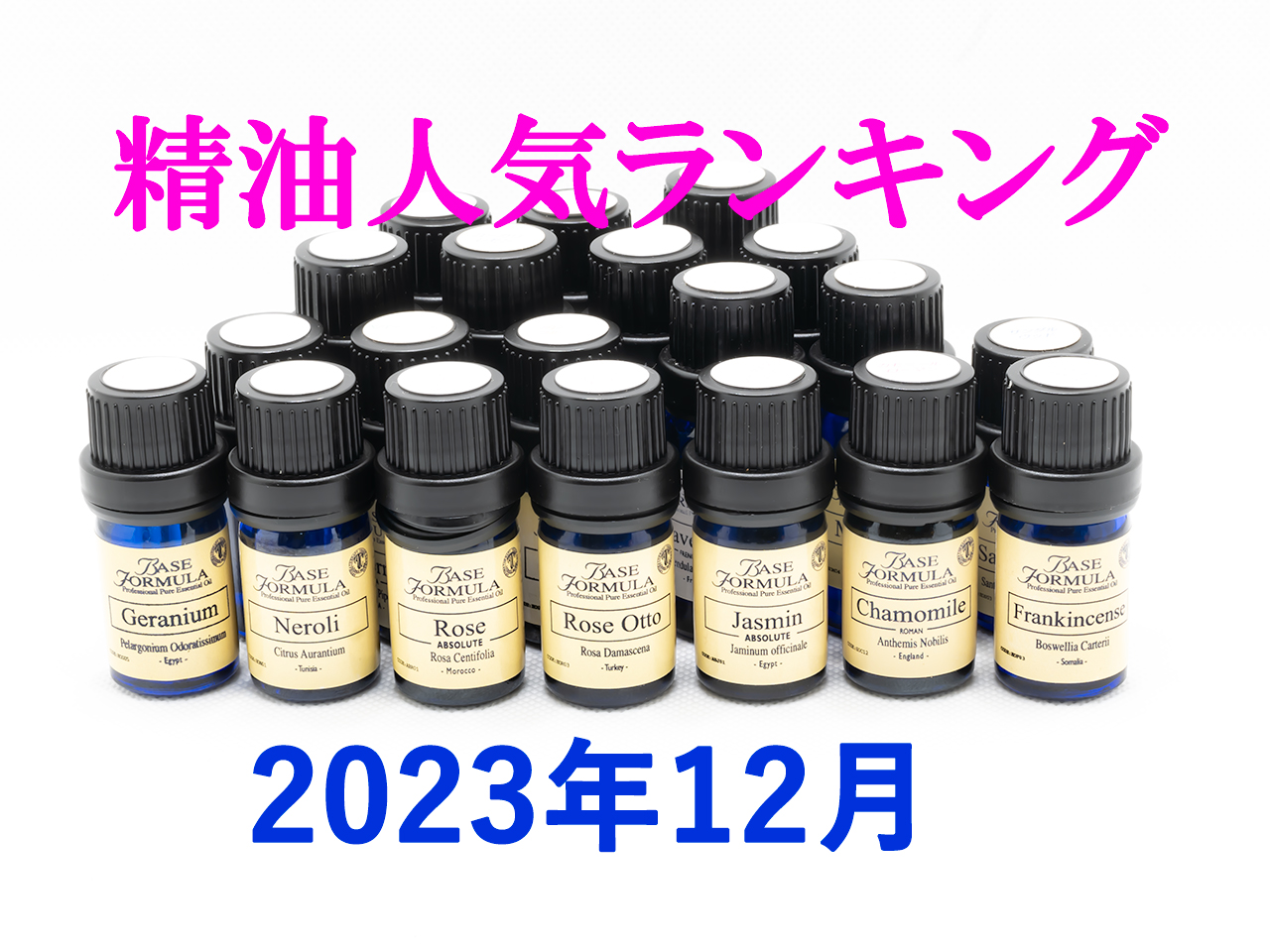 2023年12月に使用された精油のランキングです。 1位 ラベンダー(27.8%) 2位 オレンジ・スイート(16.7%) 2位 ゼラニウム(16.7%) 4位 イランイラン(11.1%) 4位 ローズマリー(11.1%) 6位 パイン(5.6%) 6位 ベルガモット(5.6%) 6位 レモンマートル(5.6%) 年の最後の月は、この1年の疲れを優しく癒してくれるラベンダー、オレンジ、ゼラニウムがたくさん選ばれました。 来年も頑張れるよう心をリセットして頂けたものと思います。 |