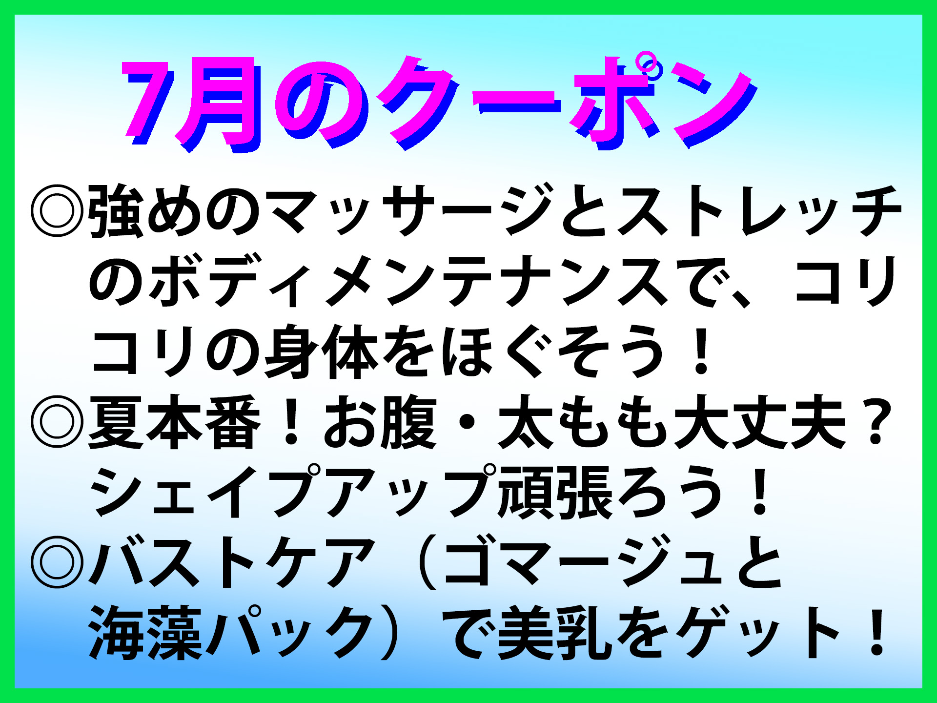 7月限定のクーポンを掲載しました。 7月のテーマは、 ◎強めのマッサージとストレッチのボディメンテナンスで、 コリコリの身体をほぐそう! タイマッサージもお得に追加できます。 ◎夏本番! お腹・太もも大丈夫? シェイプアップ頑張ろう! ◎バストケア(ゴマージュと海藻パック)で 美乳をゲット! です。 |