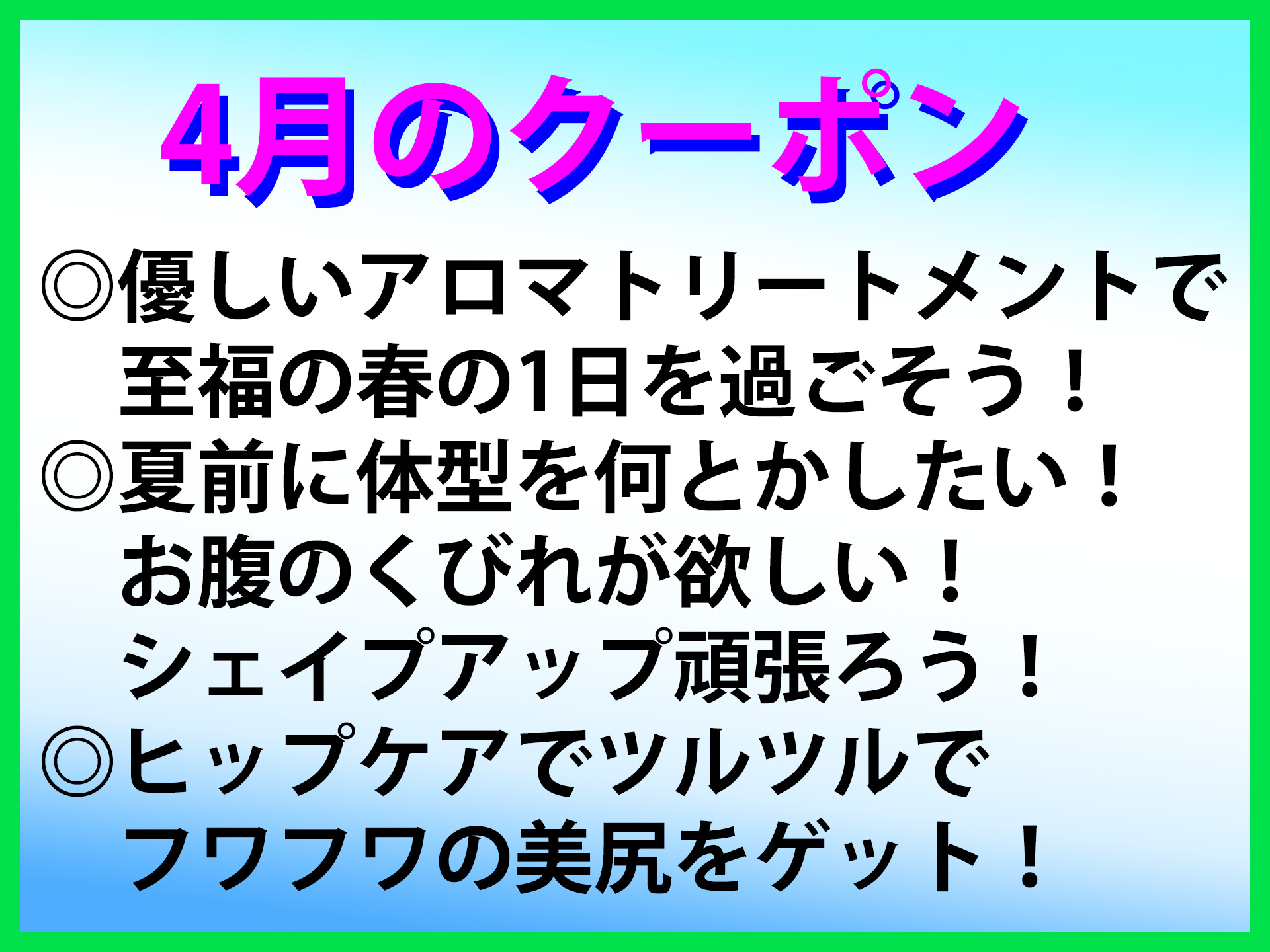 4月限定のクーポンを掲載しました。 4月のテーマは、 ◎優しいアロマトリートメントで心と体を癒し、 元気になろう! ◎夏前に体型を何とかしたい! お腹のくびれが欲しい! シェイプアップ頑張ろう! ◎ヒップケアでツルツルでフワフワの美尻をゲット! です。 とても過ごしやすい季節になりました。 そのな穏やかな日にやさしいアロマトリートメントでゆっくりリラックスするのは正に至福の時間ですよ。 今年の夏は海に行って水着を披露したいと思っている方は、少しでも体型を整えたいですよね。 シェイプアップマッサージやお腹のマッサージで、少しでもスリムになりましょう。 水着で綺麗なヒップを見せたい方はヒップケアもお忘れなく! また、四月は入学、入社シーズンですね。 『お祝いクーポン』がありますので、該当するクーポンを見つけて下さいね。 ご本人はもちろんですが、該当するお子様を持つお母様も『お母様ご苦労様クーポン』が使えますよ。 |