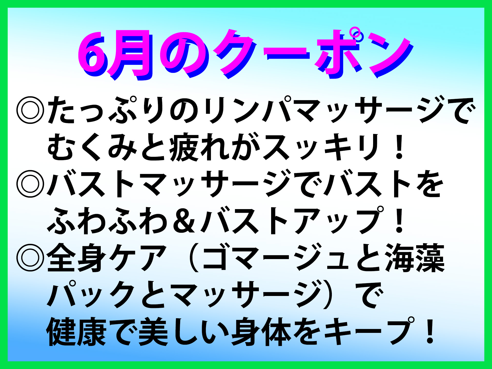 6月限定のクーポンを掲載しました。 6月のテーマは、 ◎たっぷりのリンパマッサージでむくみと疲れがスッキリ! ◎バストマッサージでバストをふわふわ&バストアップ! ◎全身ケア(ゴマージュと海藻パックとマッサージ)で健康で美しい身体をキープ! です。 6月はリンパマッサージの150分コース、180分コースがお得です。 梅雨時は汗が出にくいのでむくみやすくなります。 そんな時はリンパマッサージでスッキリしましょう。 気持ち良いバストマッサージもお得に受けられます。 バストアップしたい方は筋トレも追加しましょう! 全身のゴマージュと海藻パックとマッサージを組み合わせた全身ケアで、お身体の隅々まで綺麗にしながら、ゆっくりして下さい。 定期的に受けると、お身体の美しさ、若さを保てますよ。 |