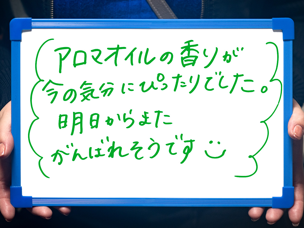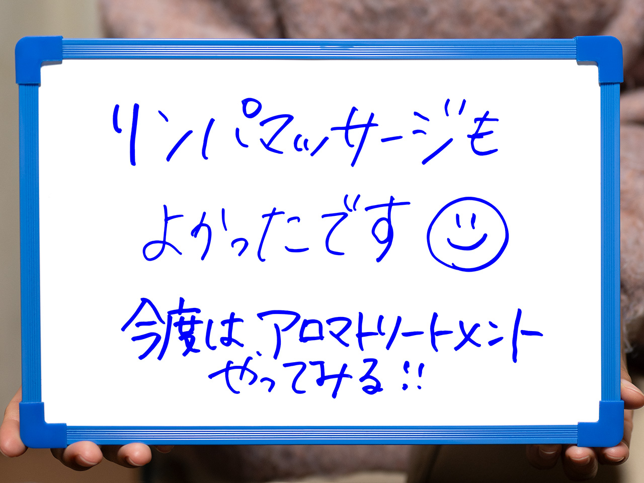 5種類のアロママッサージの内、4種類を体験されたお客様。 今回はリンパマッサージでした。 全身を強めに擦ってリンパを流すリンパマッサージ。 全身の浮腫みがスッキリ取れて、身体全体が軽くなったようです。 次回はいよいよ最後に残されたアロマトリートメントです。 |