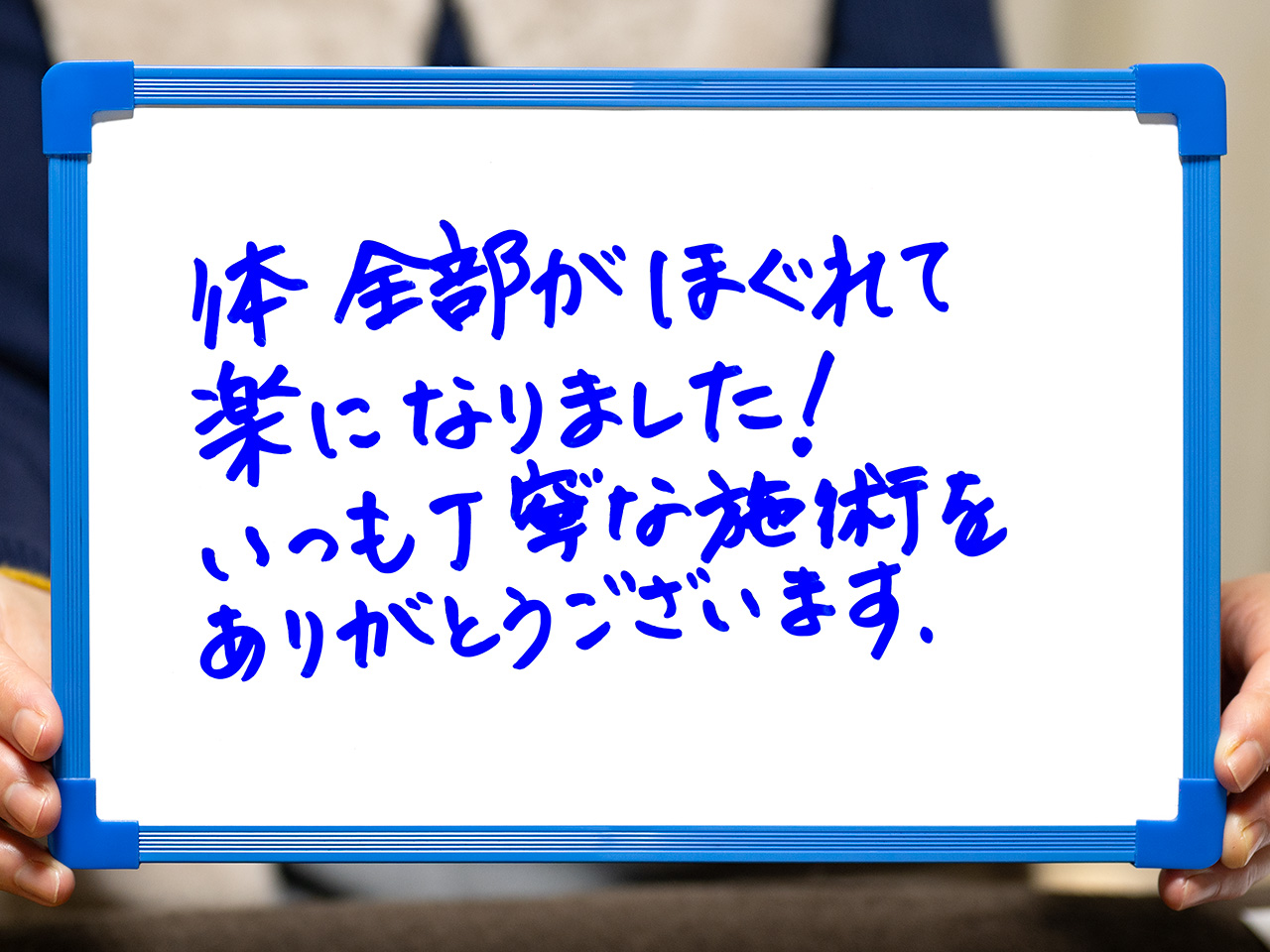 ★いつも丁寧な施術をありがとうございます★ 頻度はそれほど多くは無いですが、何年も前から通ってくれているお客様。 立ちっぱなしの仕事で、全身のコリや疲れが溜まります。 お客様の状態に合わせて、丁寧に施術させて頂いています。 施術中に気付いたことやご要望があれば遠慮なくお申し出下さいね。 |