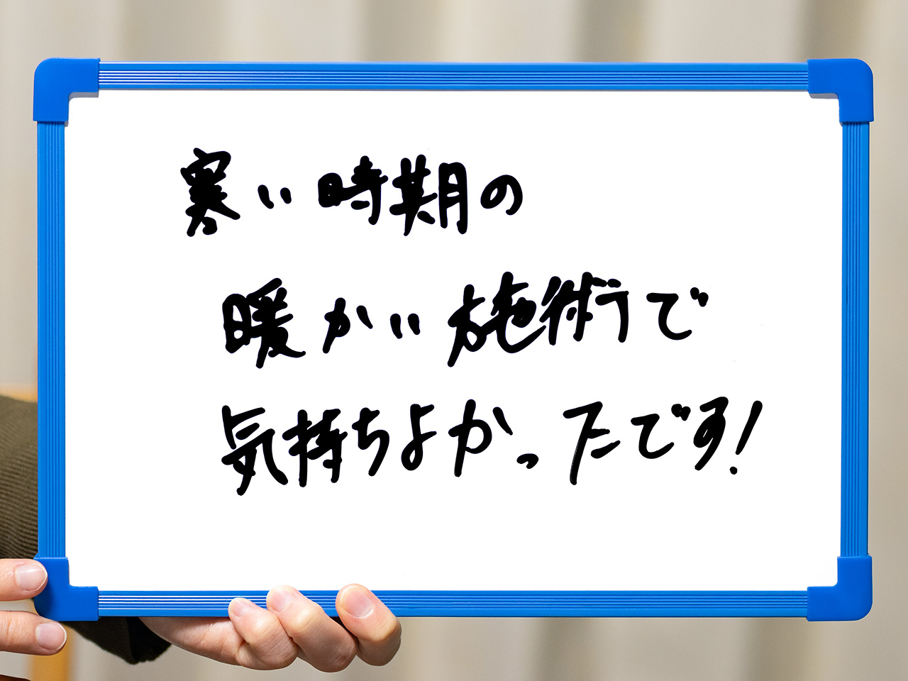 ★温かい施術で気持ち良かった!★ 温かい手によるオイルマッサージはとても気持ち良いです。 特に寒い時期は尚更ですね。 温かい手が冷えた背中の上を滑っていくと、冷たい肌だけでなく、心の仲も冷たさが温かさに変わり、ホッとした気持ち良さが生まれます。 固くなった肌や筋肉も柔らかくなり、とろけるような感じになります。 気持ち良さを感じているうちに、いつの間にか眠りに入っていきます。 施術が終わった後は、身体がとても軽くなり、心も軽くなり、元気が蘇ってきますよ。 |