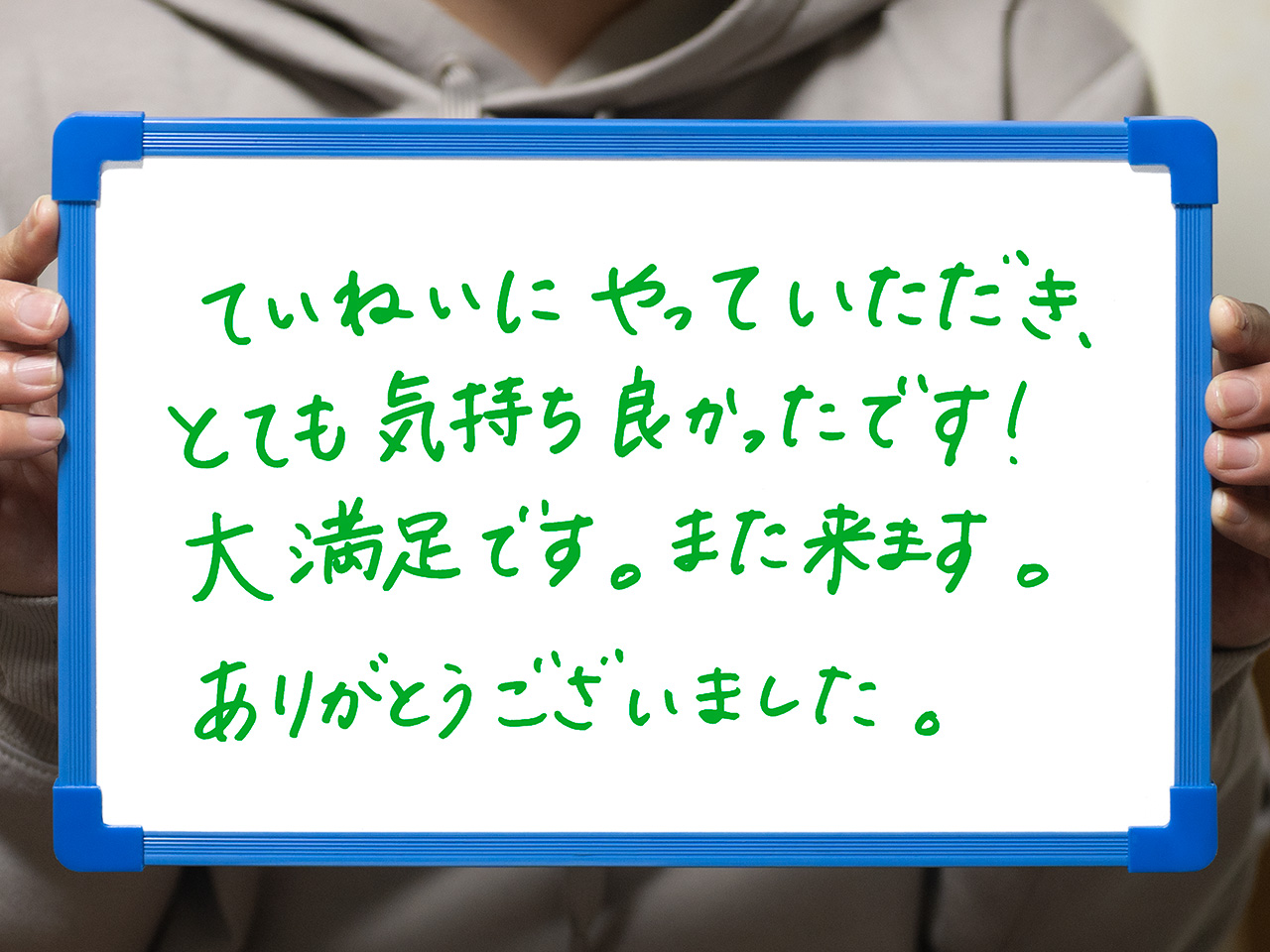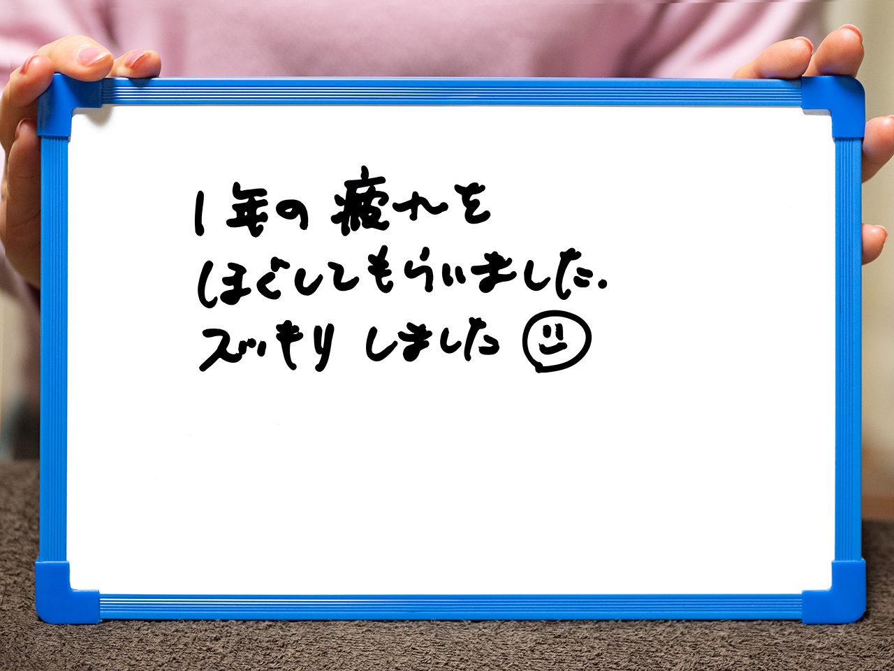 ★1年の疲れをほぐしてもらった★ 毎月疲れをほぐしてもらいたいと思っていてもなかなか来られないお客様も多いです。 それどころか、1年に1度、あるいは2、3に1度にお越しになるお客様も結構いらっしゃいます。 溜まった疲れを癒すのもスッキリして、生きている実感を感じることができますね。 |
